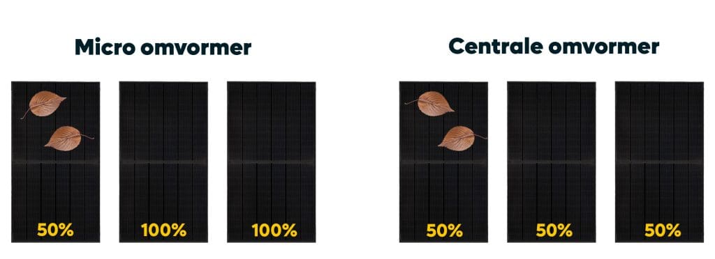 Wel is het handig om te weten dat het effect van schaduwwerking bij het ene zonnepanelensysteem meer invloed heeft dan het andere. Bij gebruik van een centrale omvormer bij een serie geschakeld systeem zitten alle zonnepanelen vast aan één kabel. Mocht één paneel minder opwekken door bijvoorbeeld de schaduw van bladeren, dan gaan de andere panelen mee met dit vermogen. Bij het gebruik van micro-omvormers zijn de panelen hun eigen systeem. Achter elk paneel zit namelijk een micro-omvormer. Doordat de panelen niet aan elkaar zijn aangesloten, hebben de bladeren op het ene paneel geen invloed op de rest van de panelen. Je kunt dit goed zien in de afbeelding hieronder.